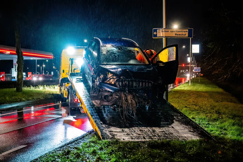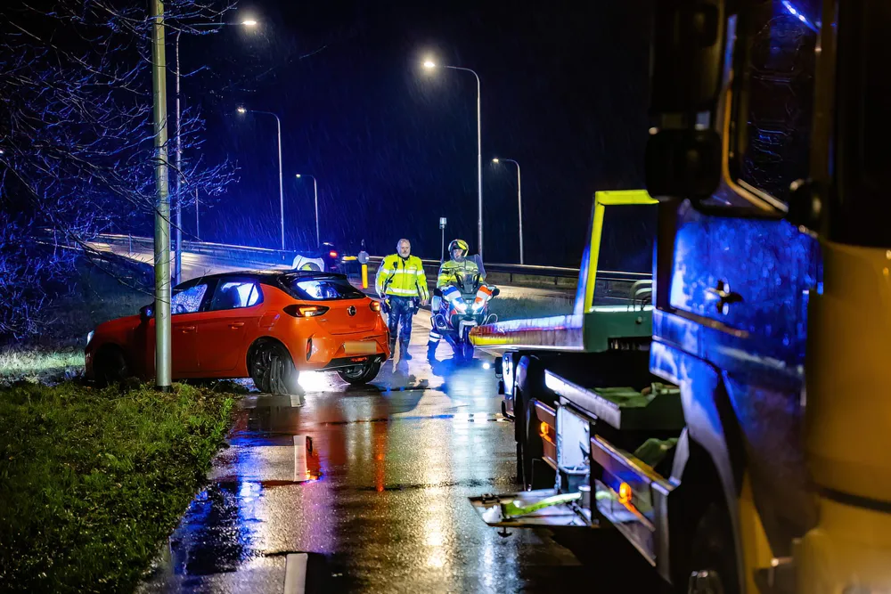 Een bergingsbedrijf heeft de auto die achterstevoren in de berm stond losgetrokken, en de auto die in de sloot lag getakeld.