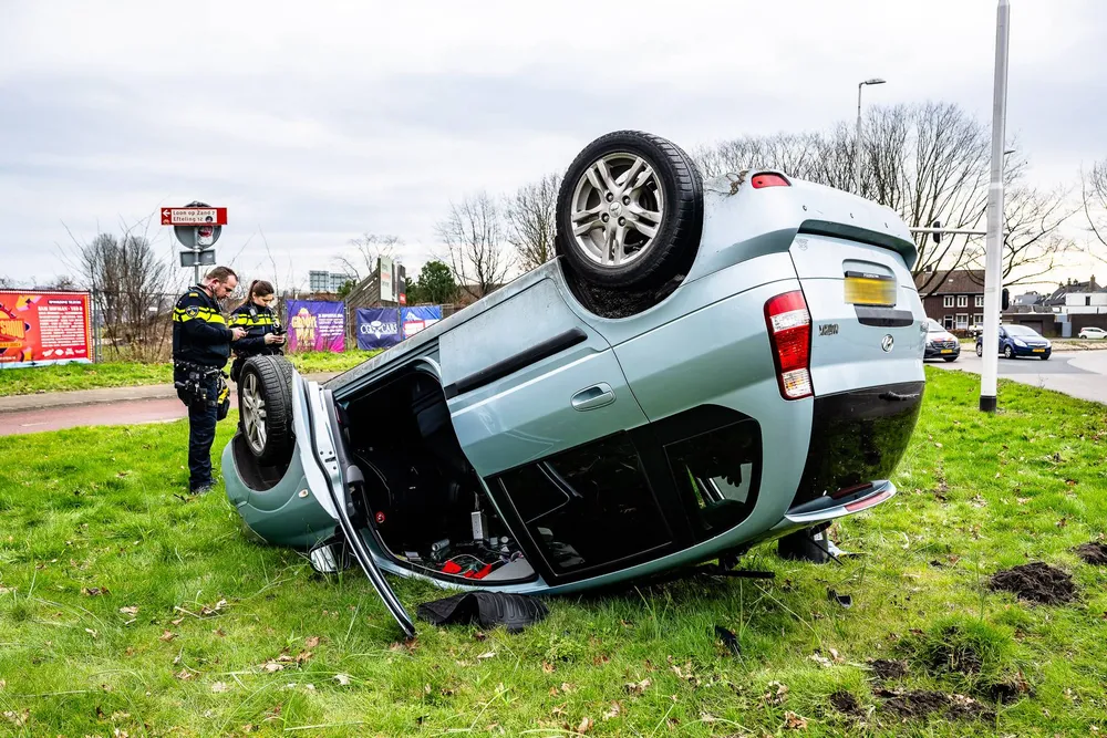 Een bergingsbedrijf heeft de auto weer op zijn wielen gezet en afgevoerd. De exacte oorzaak van het ongeval is niet bekend.