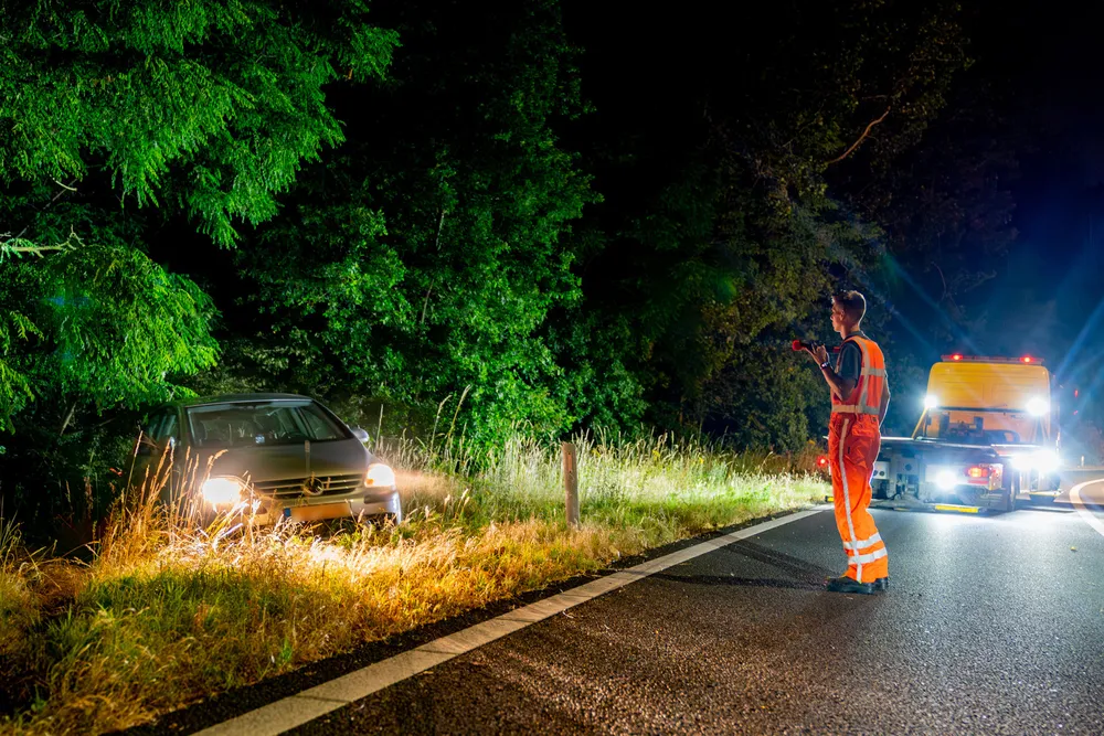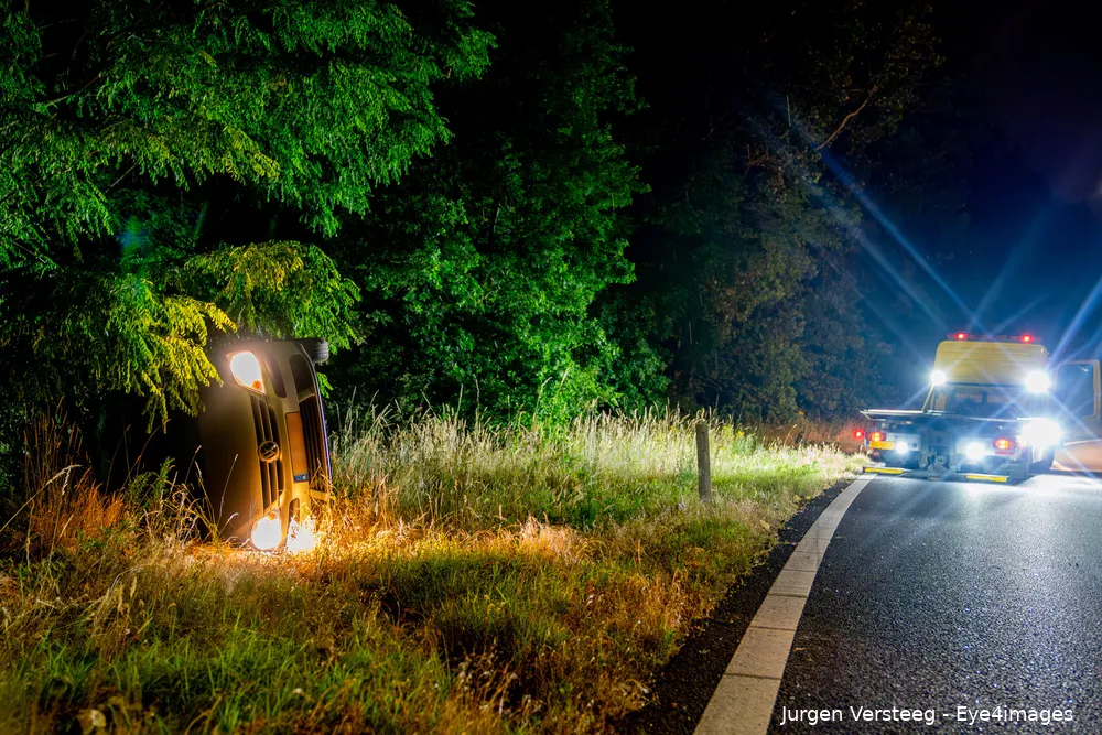 Den Bosch - Een automobilist is in de nacht van maandag op dinsdag de macht over het stuur verloren en op zijn kant terecht gekomen. Dit gebeurde net na middernacht op de A59 op de afrit Den Bosch West.