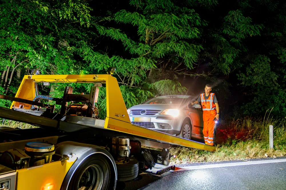 Een berger heeft de auto recht getrokken en meegenomen. De afrit was tijdens het ongeval afgesloten.