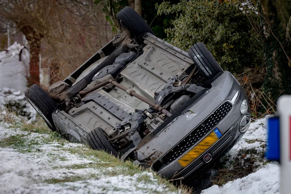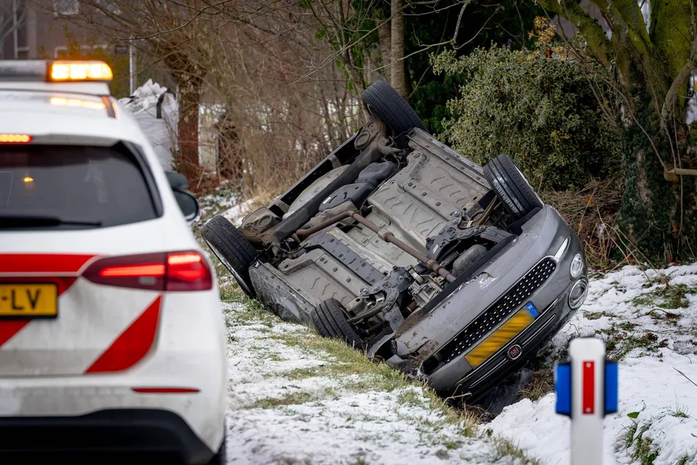 De bestuurster bleef bij het ongeval ongedeerd. Hulpdiensten kwamen ter plaatse om de situatie veilig te stellen. Een bergingsbedrijf zal het voertuig weer op de wielen zetten en afvoeren.