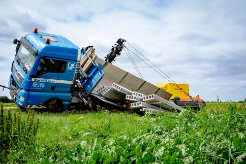 SPRANG-CAPELLE - Vanmorgen is een vrachtwagen bij Sprang-Capelle van de weg geraakt, waarbij de vrachtwagen zijn lading betonnen vloerplaten heeft verloren. Het incident vond plaats op de Dellenweg na een verkeerde inhaalactie, waarbij het voertuig in de berm belandde en de controle verloor. De vrachtwagen kwam hierdoor in de naastgelegen sloot terecht.