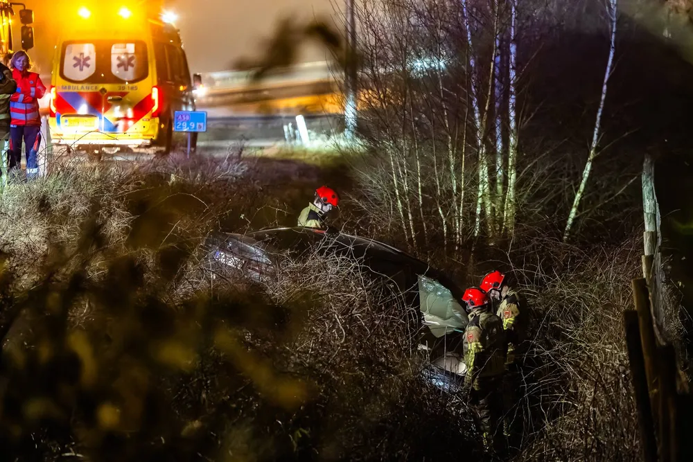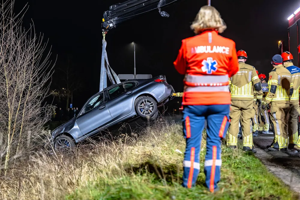 Met warmtebeeldcamera’s zochten brandweerlieden en politieagenten de omgeving af naar mogelijke inzittenden, maar er werd niemand aangetroffen. Het zwaar gehavende voertuig is door een bergingsbedrijf afgevoerd.