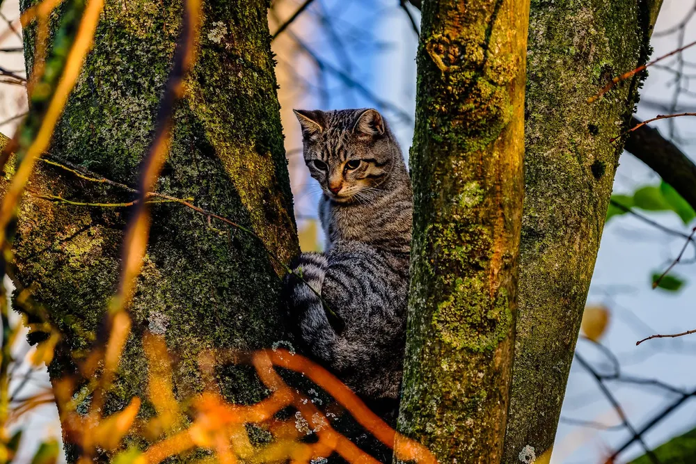 De eigenaresse had haar kat, een grijs-zwarte poes, al een dag vermist toen ze haar hoog in een boom ontdekte.
