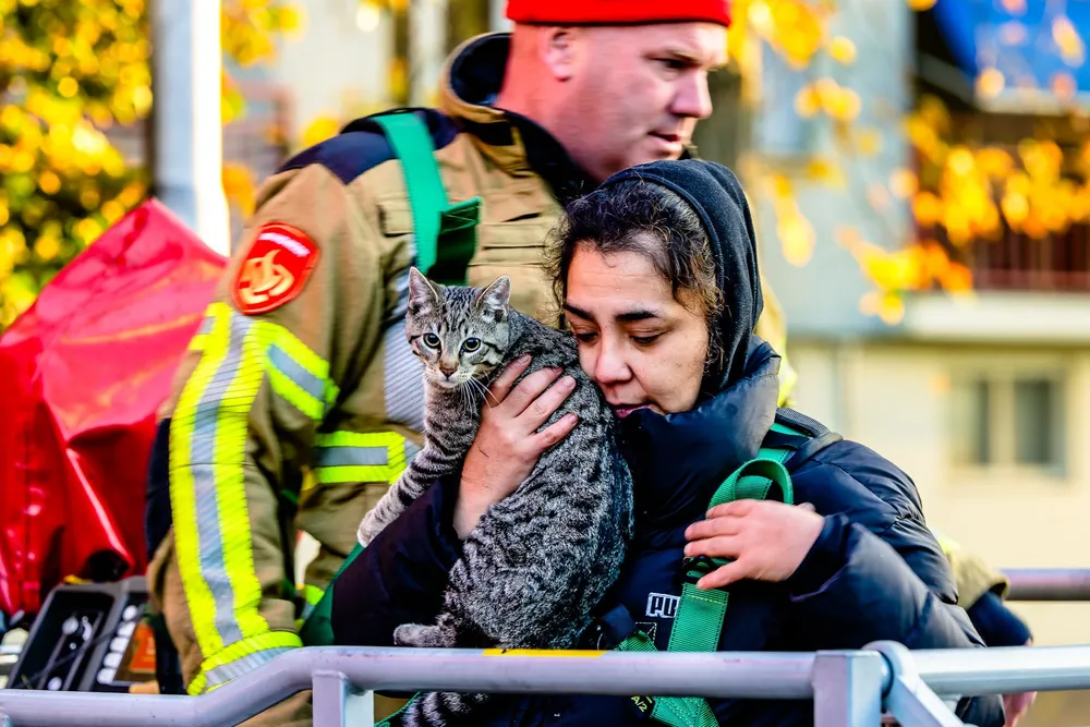 Eenmaal boven kon de eigenaresse de jonge, bange poes veilig vastpakken. De vrouw bedankte de brandweermannen hartelijk voor hun hulp bij het redden van haar geliefde huisdier.