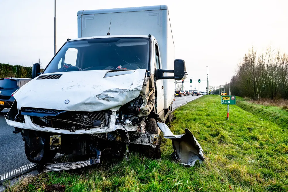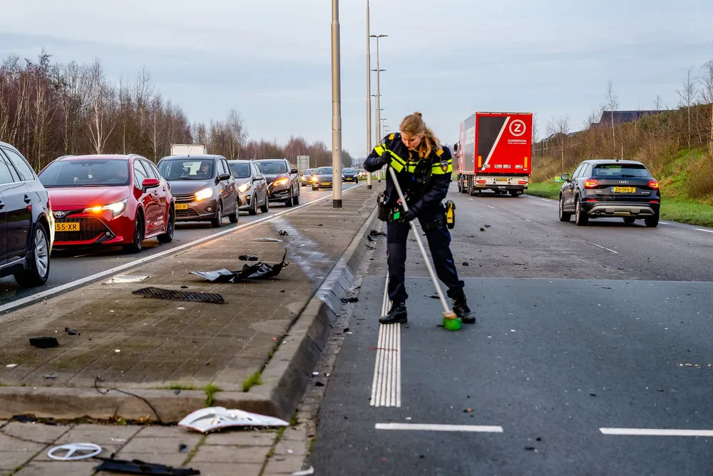 Een bestelwagen botste in de flank van een personenauto, waarna de bestelwagen stuurloos raakte en over de middenberm schoot. Het voertuig kwam pas 100 meter verder tot stilstand aan de overkant van de weg.