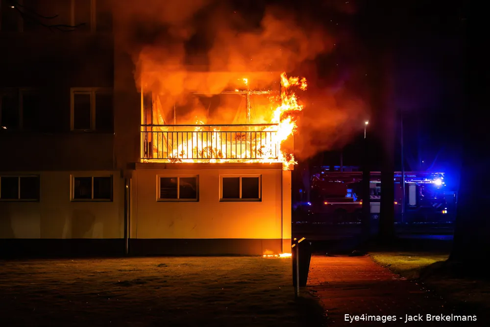 TILBURG - Felle brand op balkon van flat, mogelijk brandstichting.
