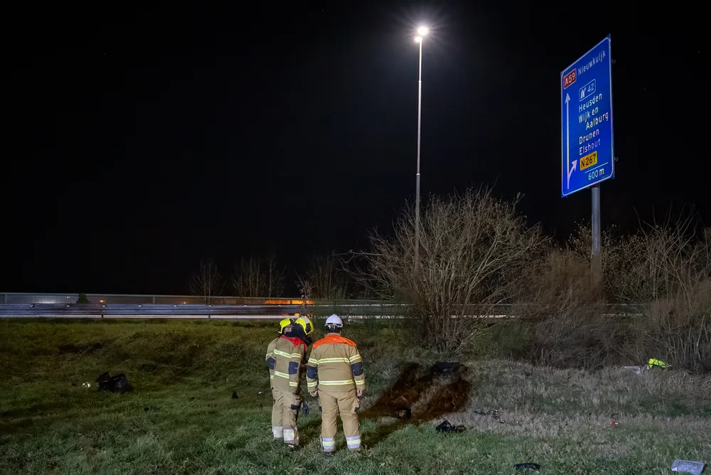 DRUNEN - Een auto is zondagavond omstreeks 20:10 uur met hoge snelheid over de vangrail van de A59 ter hoogte van Drunen geslagen en onderaan het talud tegenover de Shell aan Spoorlaan tot stilstand gekomen.