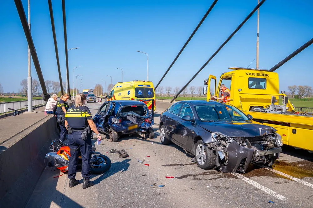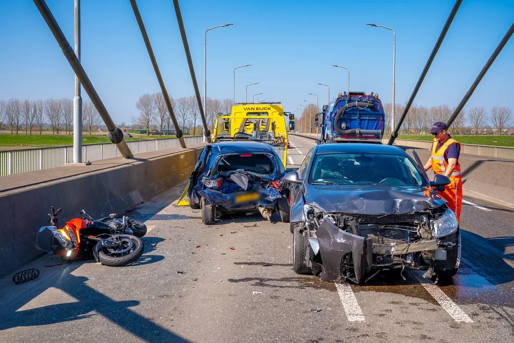 Op de Heusdensebrug (N267) tussen Wijk en Aalburg en Heesbeen heeft vrijdagmiddag een kettingbotsing plaatsgevonden waarbij drie auto's en een motor betrokken waren.