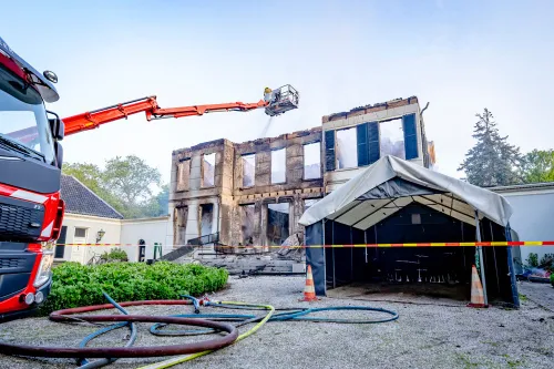 BREDA - De schade na de grote brand in het landhuis aan de Burgtsedreef in Breda is goed te zien. Enkel de voorgevel staat nog overeind en er is instortingsgevaar.