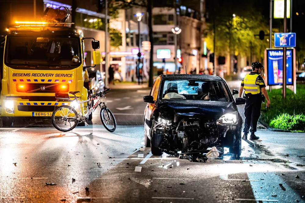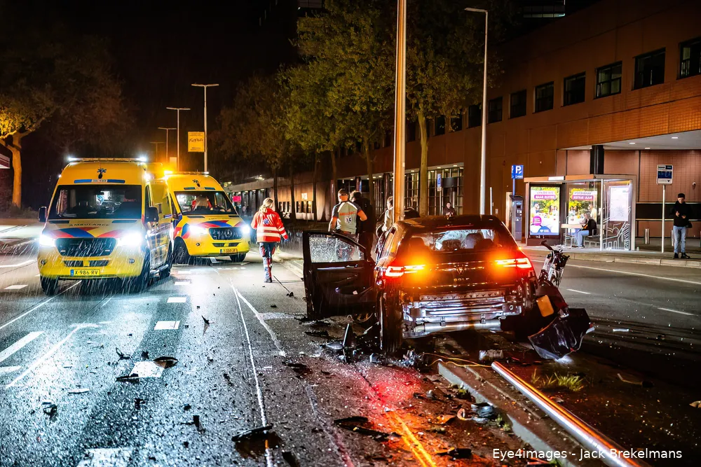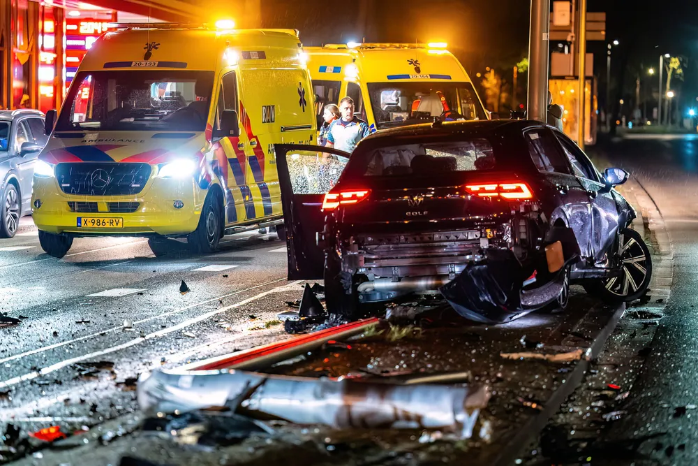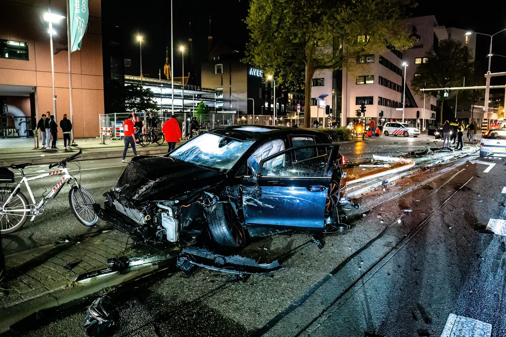 TILBURG -Een spectaculaire botsing tussen drie voertuigen op de Spoorlaan in Tilburg zorgde zondagochtend rond 00:05 uur voor een enorme ravage en één gewonde.