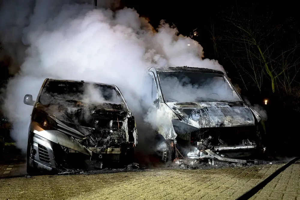 Tilburg - Bij een brand op een parkeerplaats van een flatgebouw aan de Sweelincklaan in Tilburg zijn maandagavond rond 21.40 uur twee bedrijfswagens volledig uitgebrand.