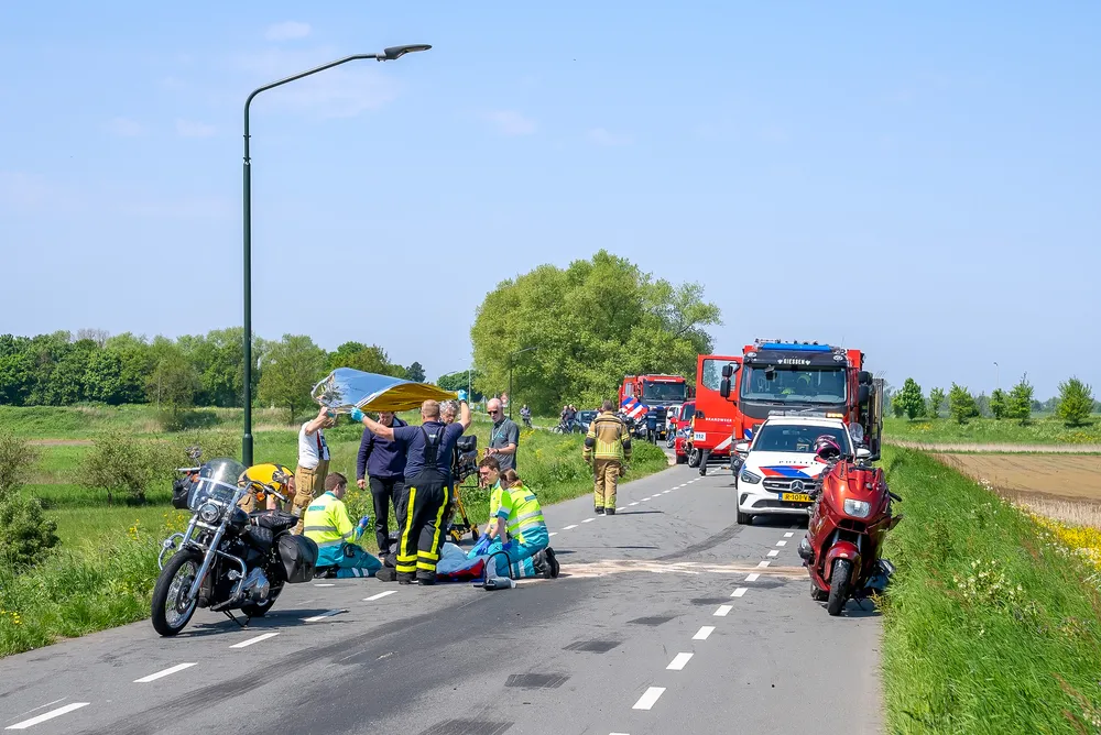 ANDEL - Twee motorrijders zijn zaterdagmiddag zwaargewond geraakt bij een ongeluk tussen vier motoren op de Hoge Maasdijk in Andel. Een derde motorrijder raakte minder zwaargewond. De drie motorrijders zijn naar het ziekenhuis gebracht.