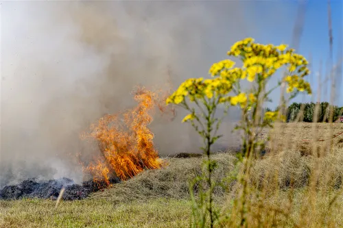 DEN HOUT – Een zeer grote brand op een akker aan de Houtsesteeg in Den hout zorgde dat een groot deel van het net gemaaide gras in rook is opgegaan.