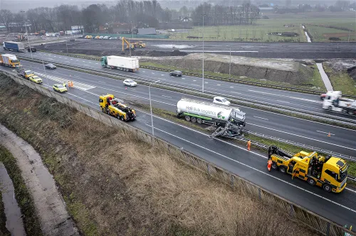 Rijkswaterstaat is druk doende met de bergingswerkzaamheden en het herstel van de vangrail. Deze werkzaamheden kunnen nog de gehele dag gaan duren.