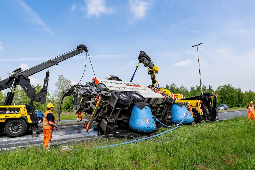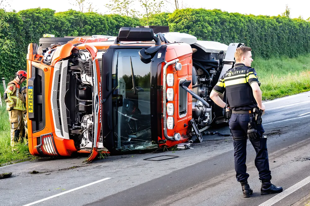 Door de klap kantelde de vrachtwagen, waardoor de weg ter hoogte van de Koolhovenlaan werd afgesloten.