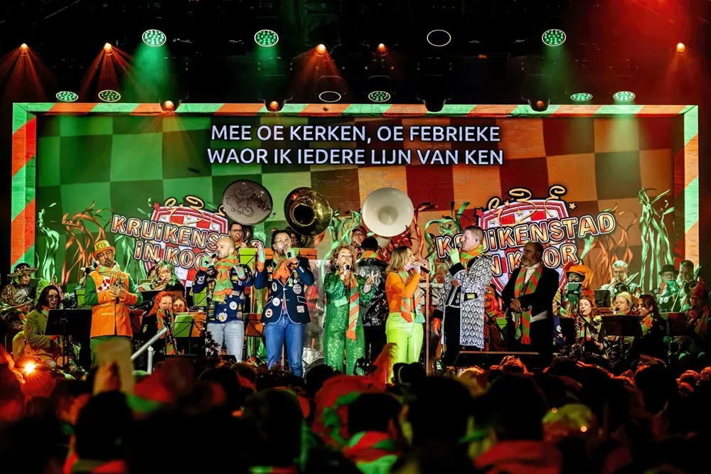 KRUIKENSTAD - Een volgepakte Heuvel zong maandagavond mee met diverse klassiekers en nieuwe carnavalshits. Het 40-koppige Kruikenstad in Koor Harmonieorkest, speciaal voor deze gelegenheid bij elkaar gebracht, zorgde voor de muzikale ondersteuning.