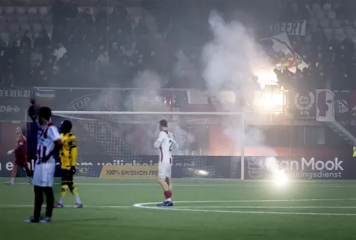 Het duel werd net voor rust ontsiert door vuurwerk wat door de eigen aanhang van Oss op het veld werd gegooid. Even daarvoor lieten de bezoekers met een ludieke actie (er werden mini autootjes op het veld gegooid) blijken het niet eens te zijn met de dag van tevoren ingetrokken auto-combi. Na het gooien van het vuurwerk restte scheidsrechter Laurens Gerrits niets anders dan de wedstrijd tijdelijk te staken.