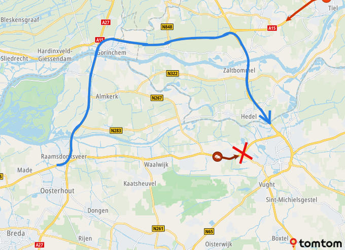 Tot die tijd blijft de weg dicht richting Den Bosch. Het verkeer richting Den Bosch wordt omgeleid vanaf knooppunt Hooipolder via de A27, A15 en de A2.